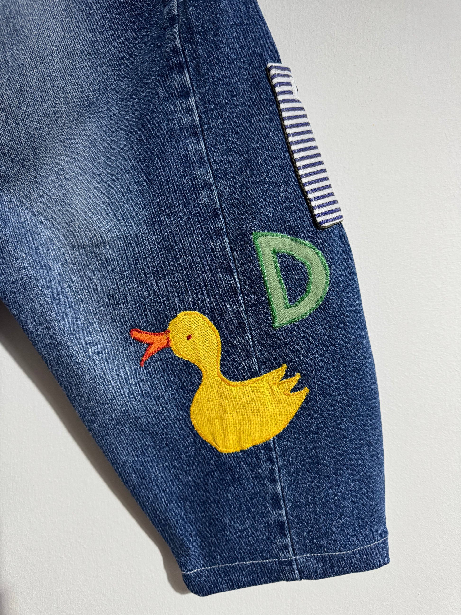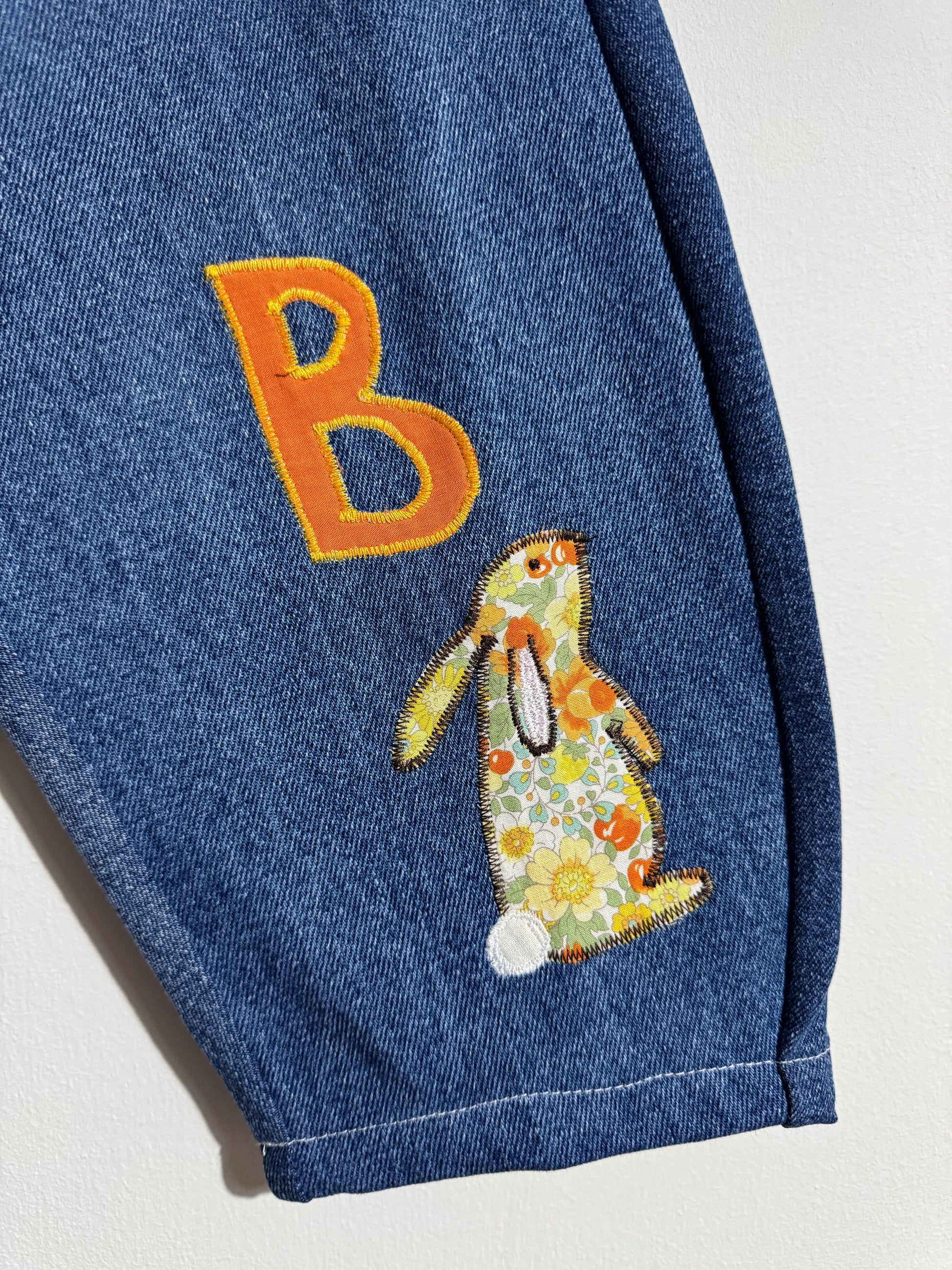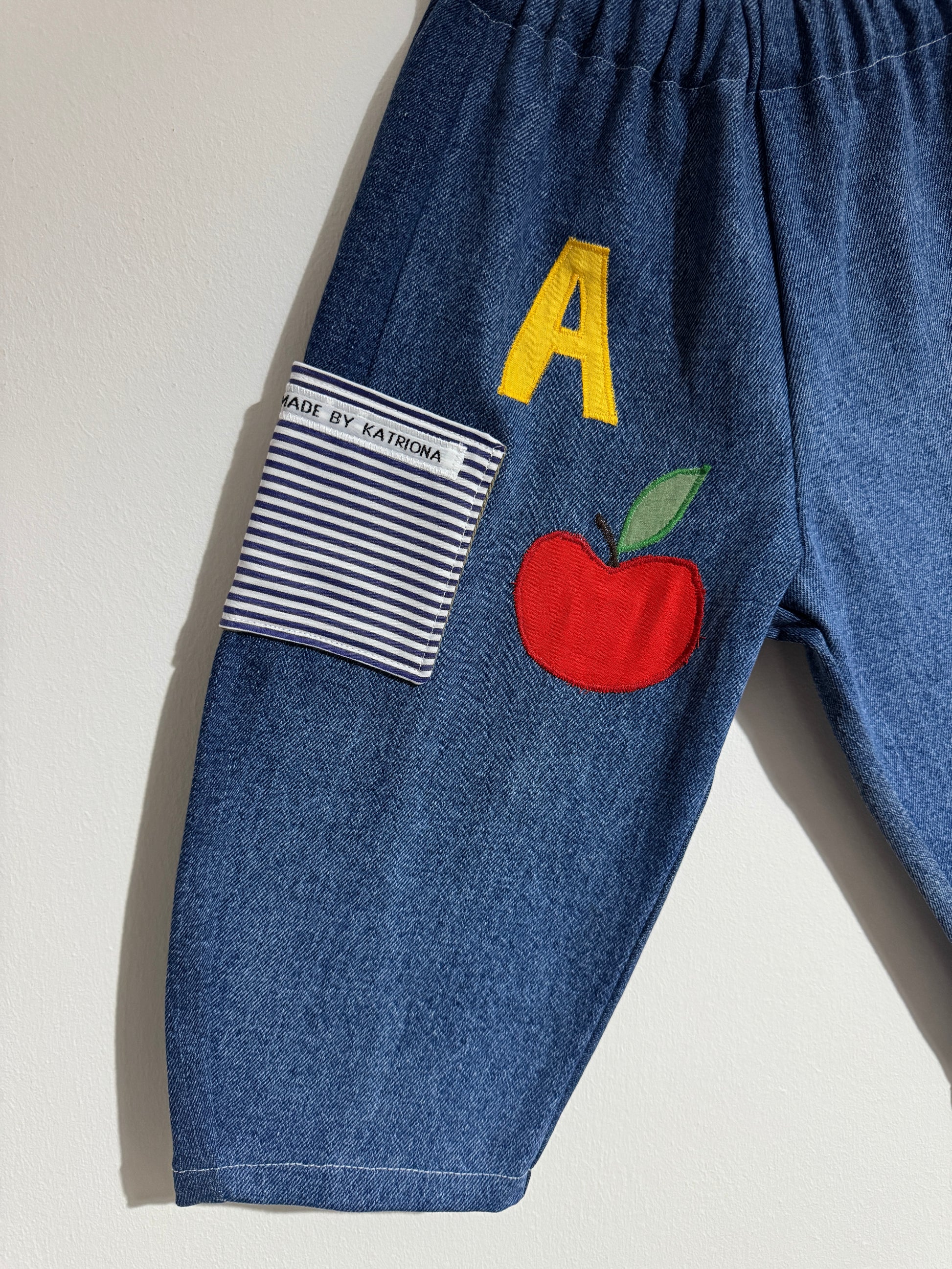Made by recycling a couple of denim blue jeans (100% cotton) using scrap fabrics, a mix of cotton & polycottons, to create the letters and motifs.