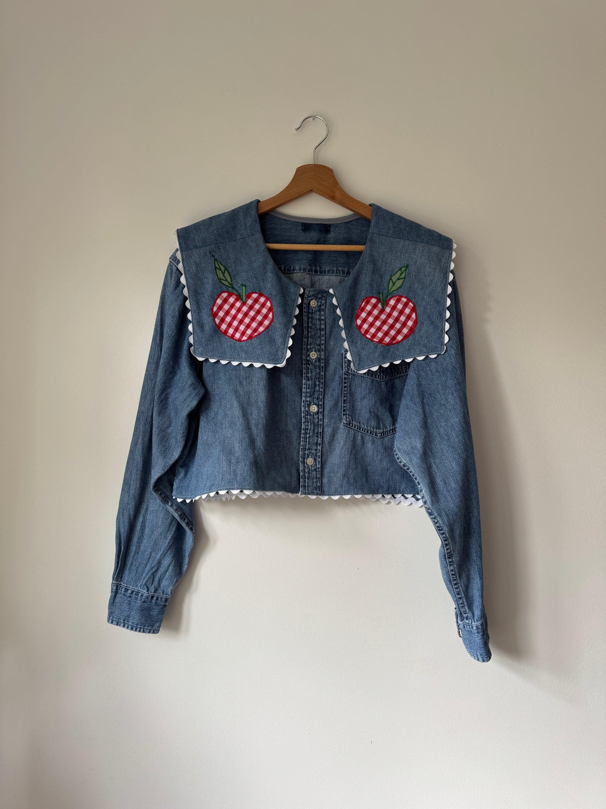 This denim shirt has been given a new lease of life with a new collar featuring red gingham apple appliqués and a new shorter more contemporary hem highlighted with scalloped edging in ric-rac ribbon.