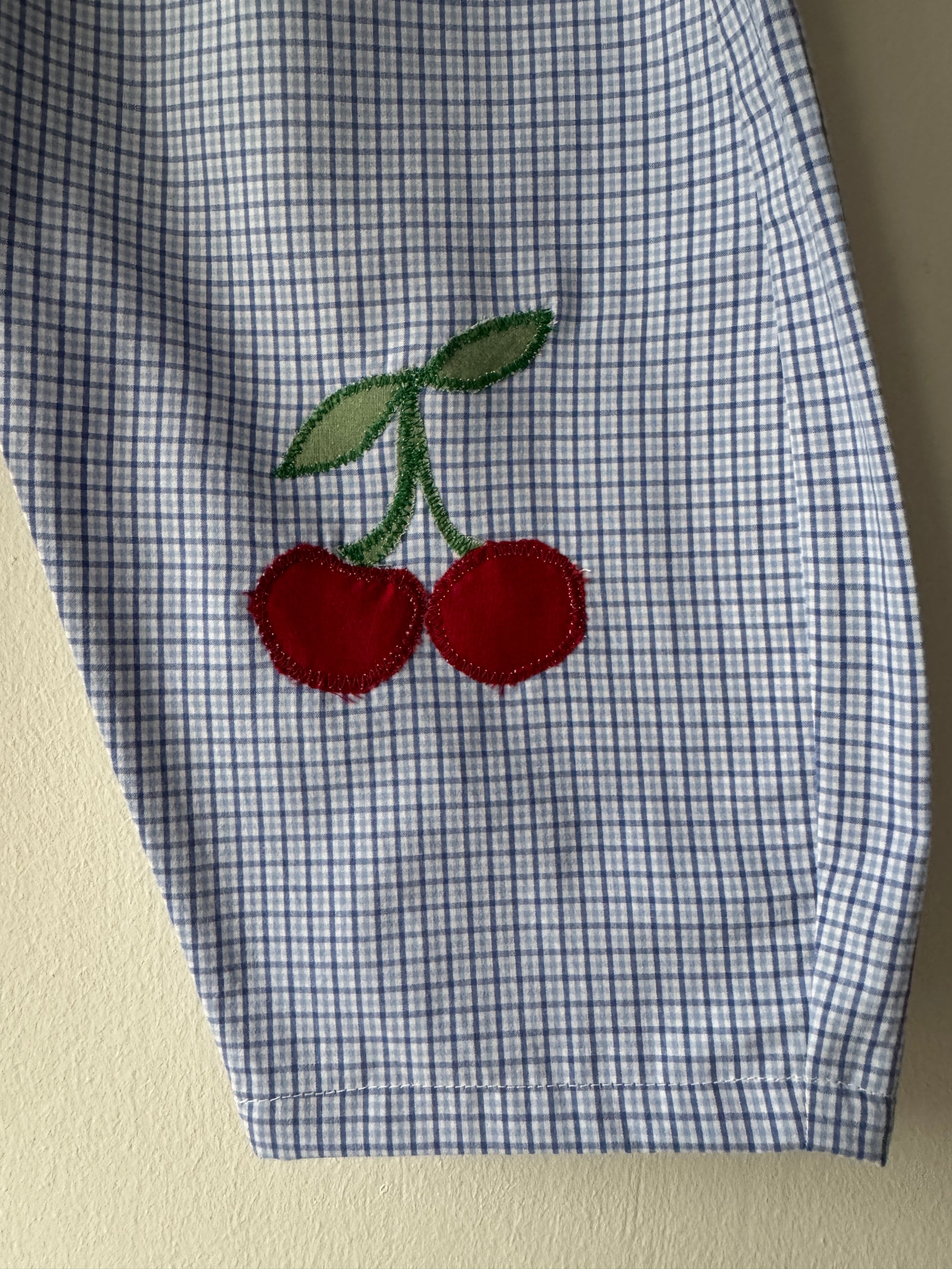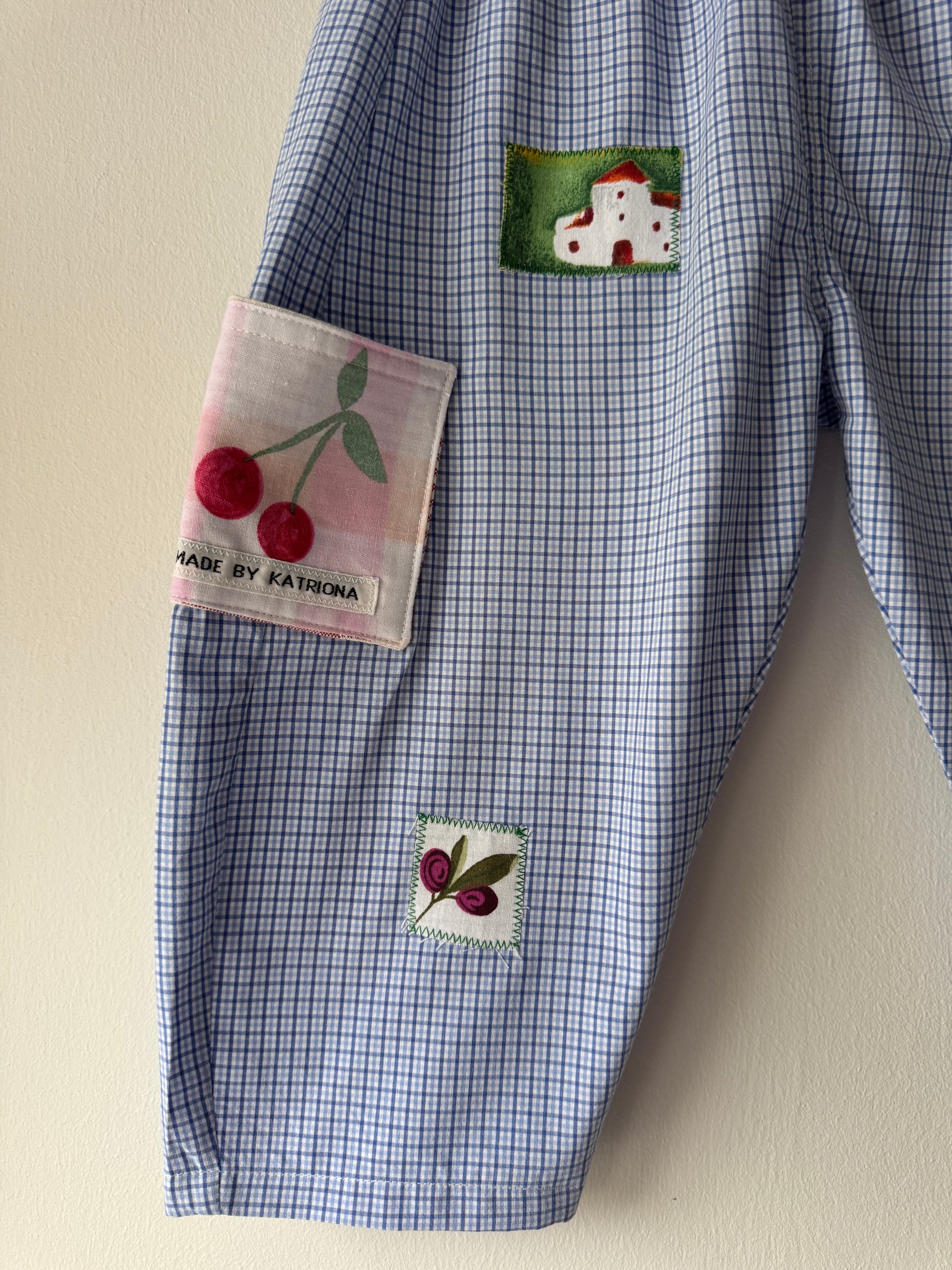 Bestie appliqué pants with motifs made from a preloved shirt. All appliqués & motifs are repurposed offcuts from other sewing projects.