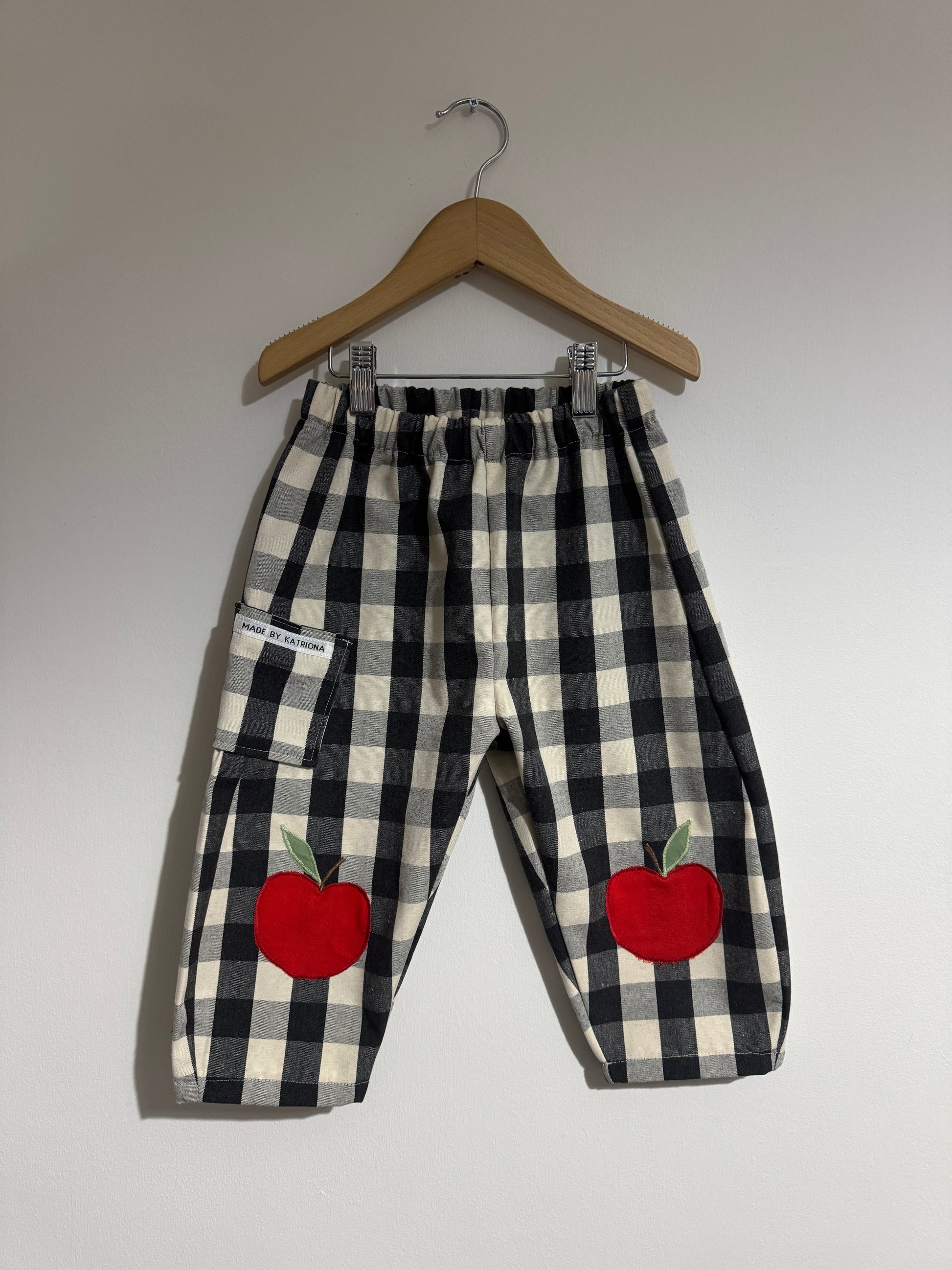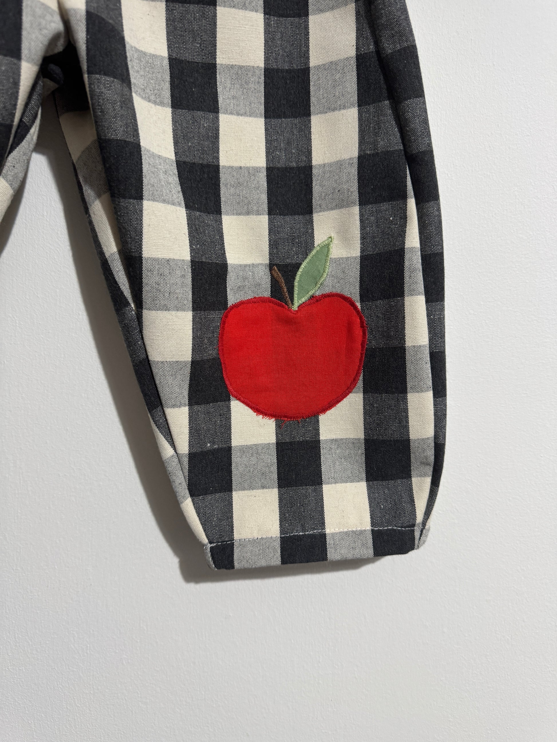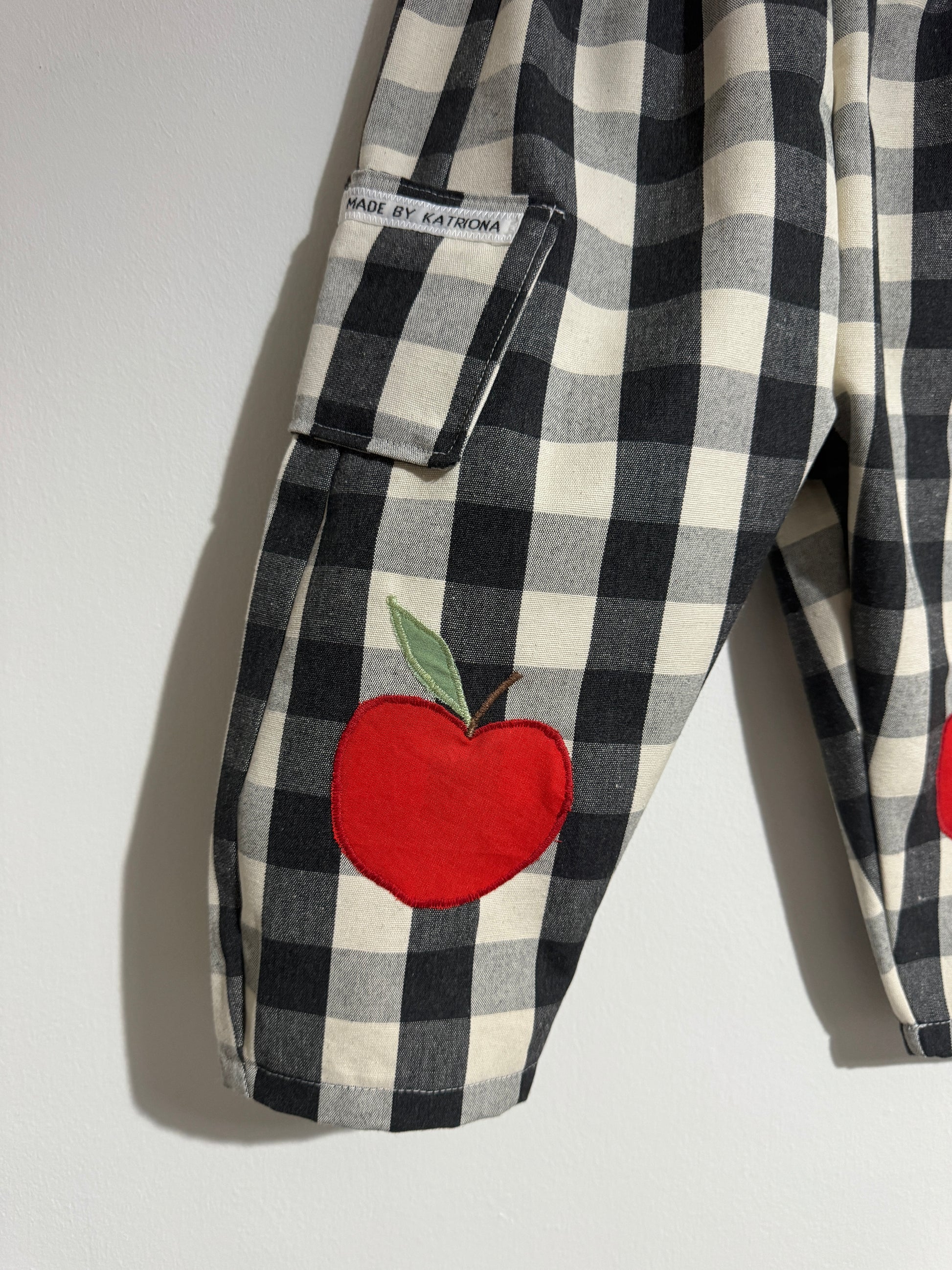A pair for the Apple of your eye, this stunning high quality cream and black 1 inch gingham has a fun pop of colour with two red Apple appliqués at the knees.