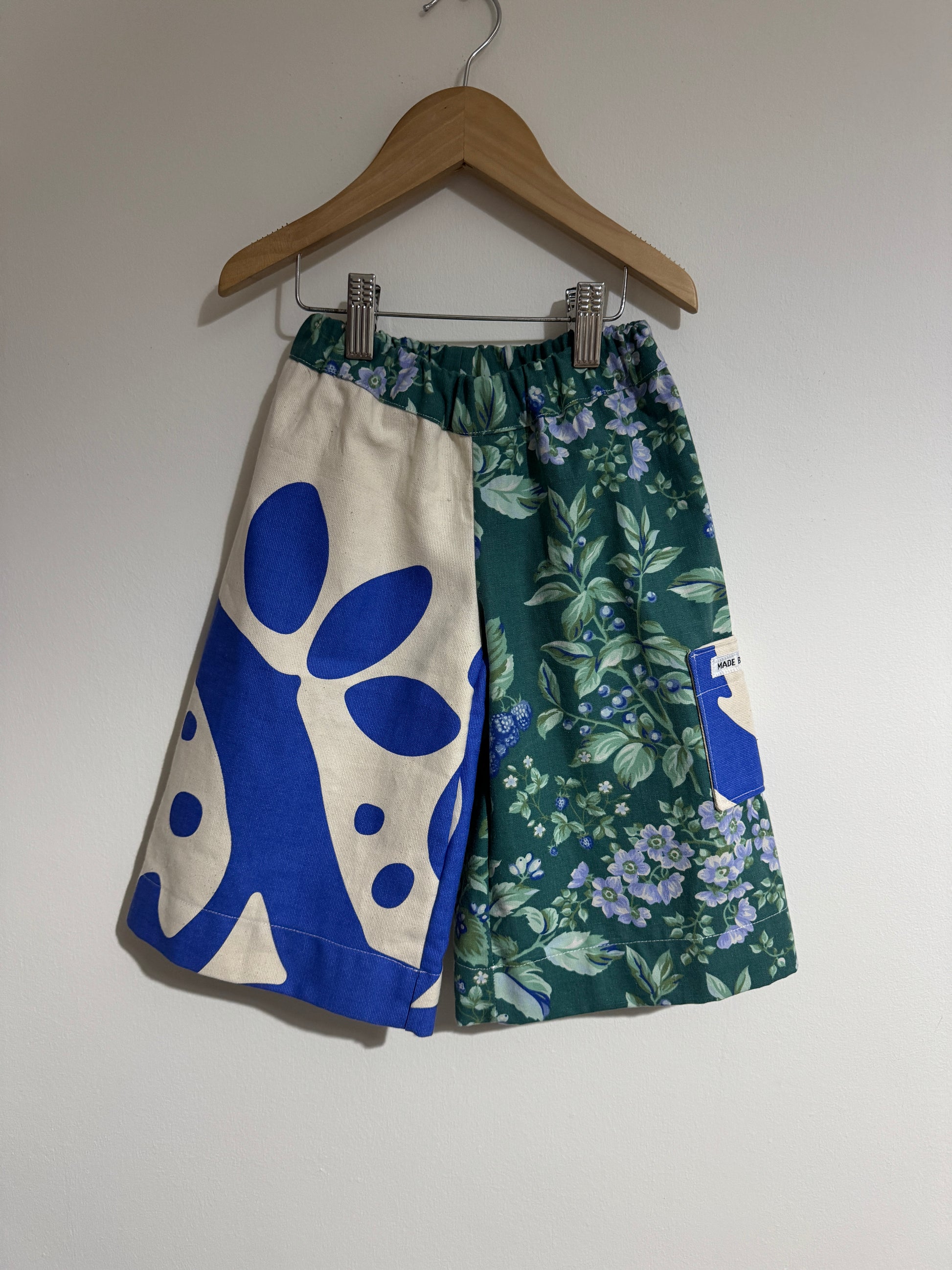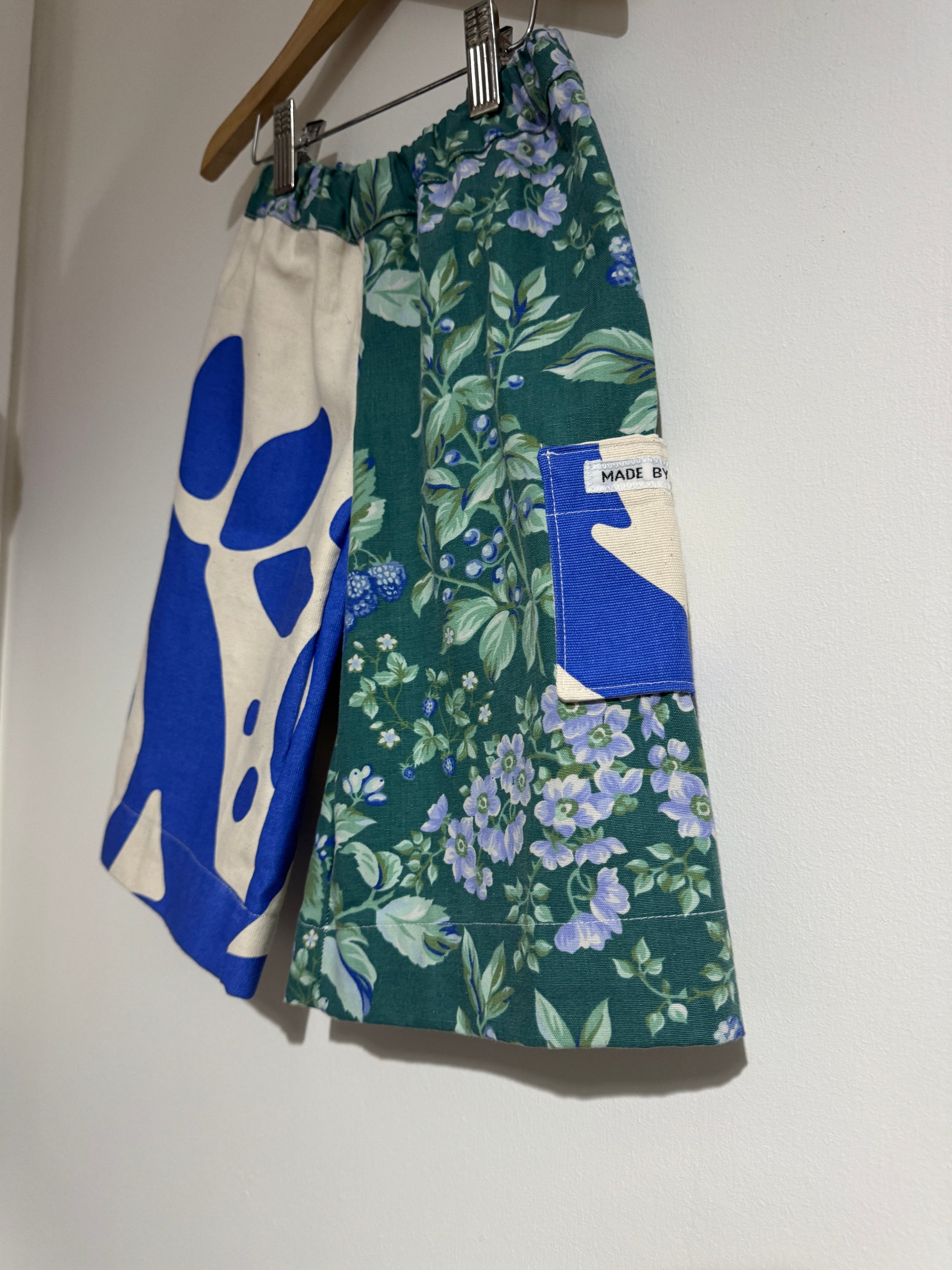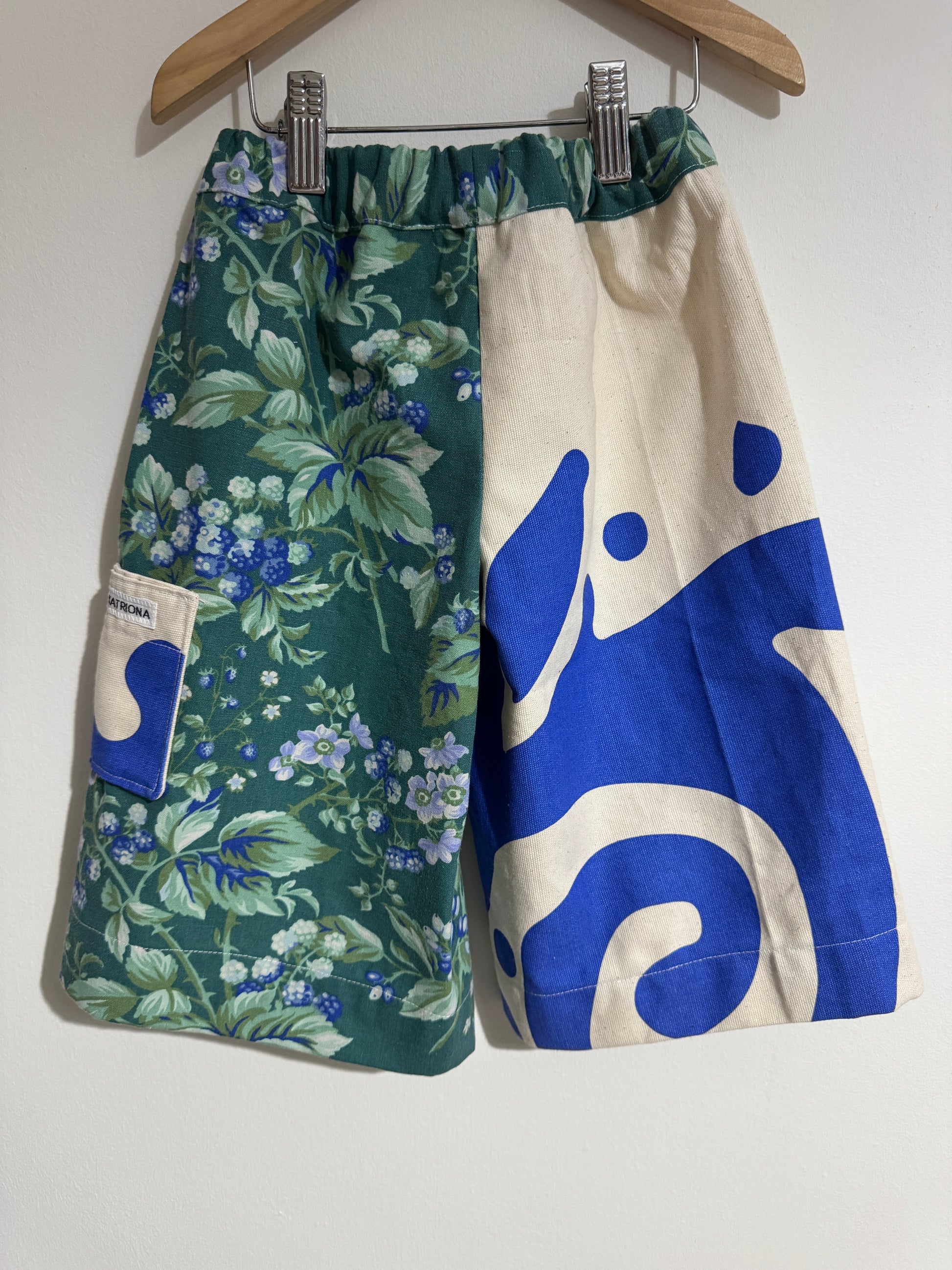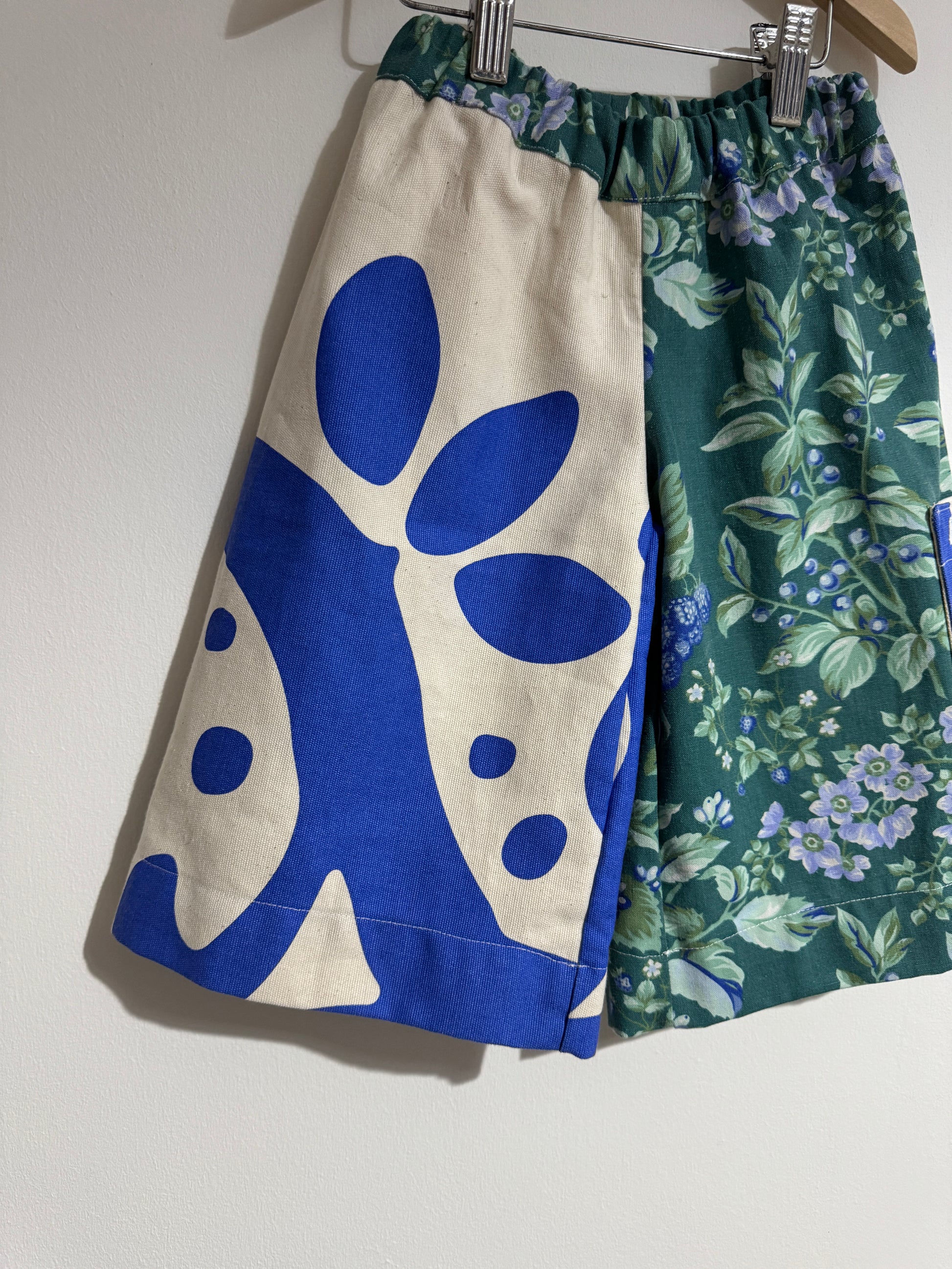 Vintage Laura Ashley green floral that was originally a cushion cover mixed with an abstract bold blue on cream.