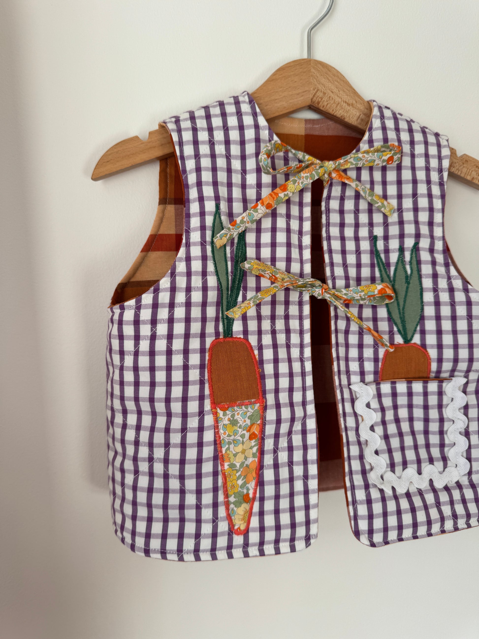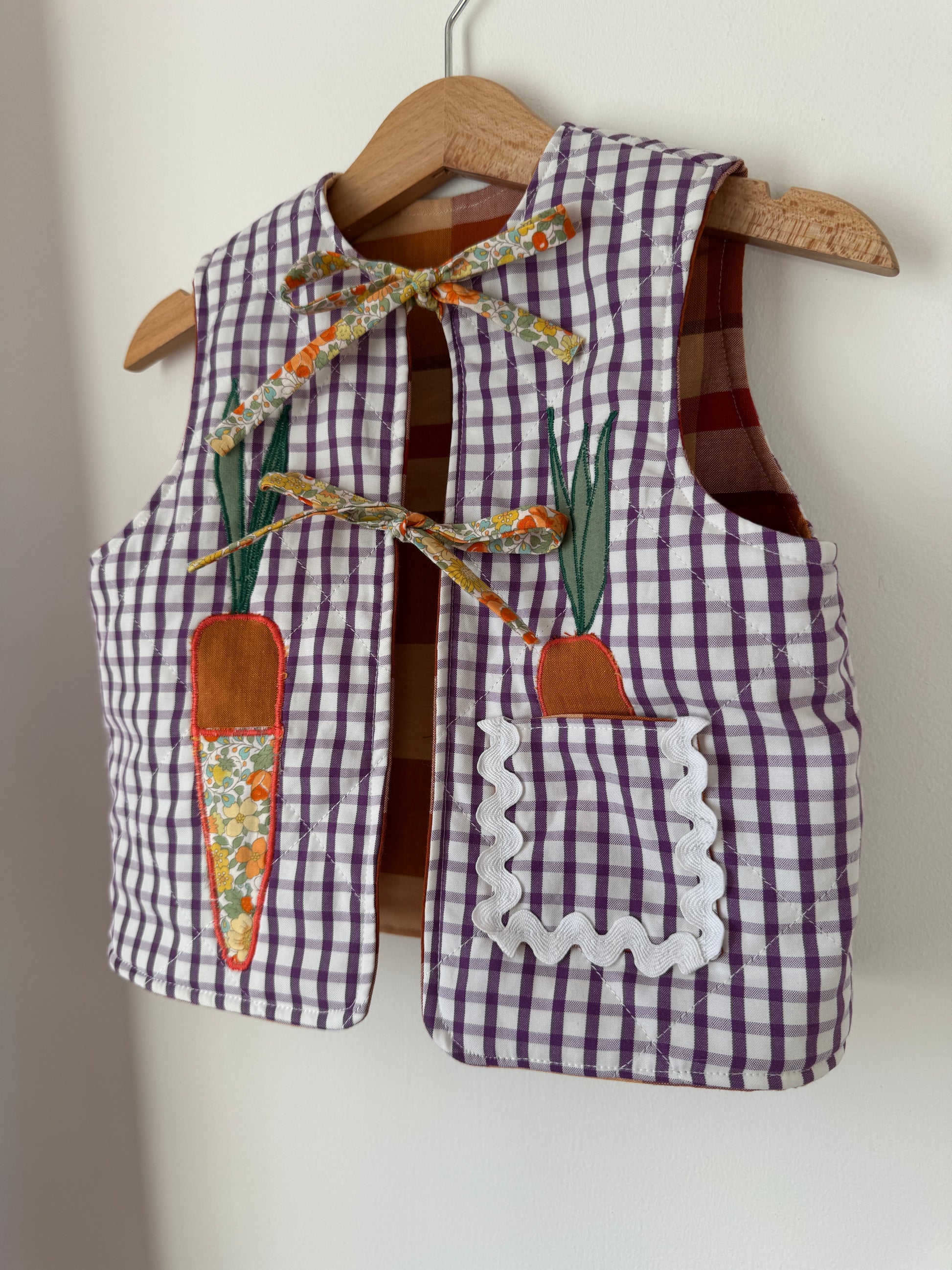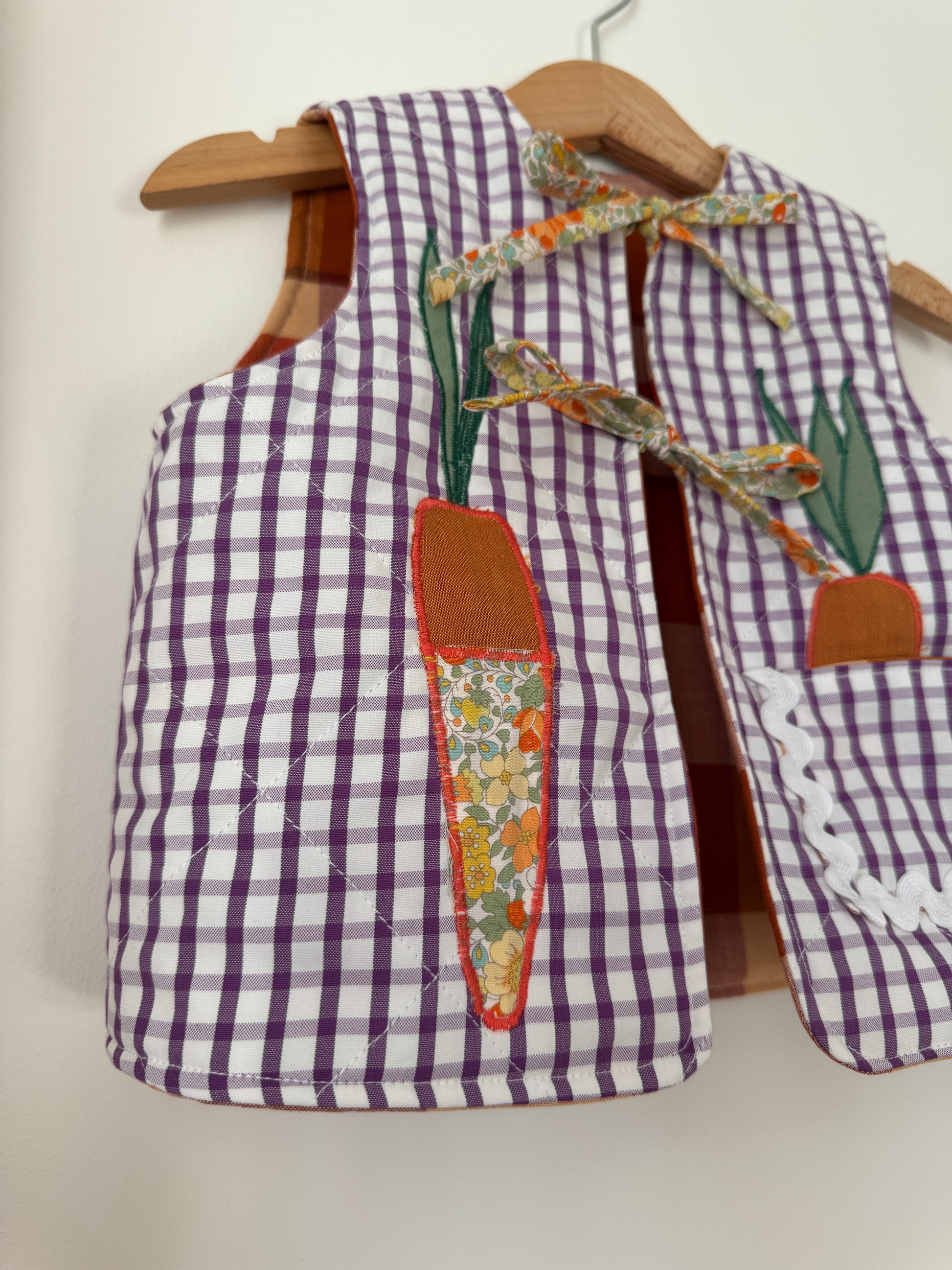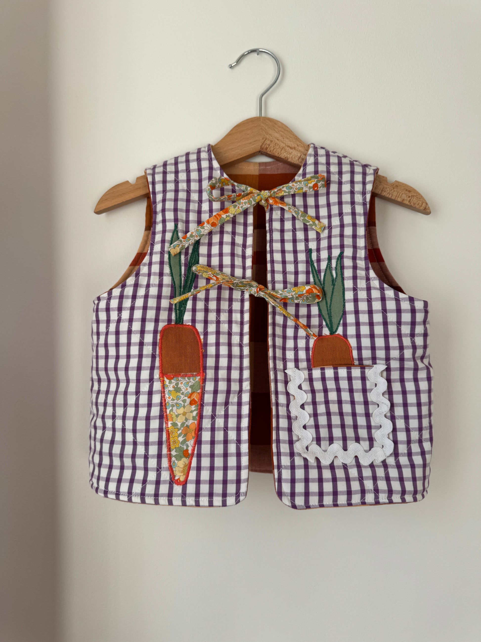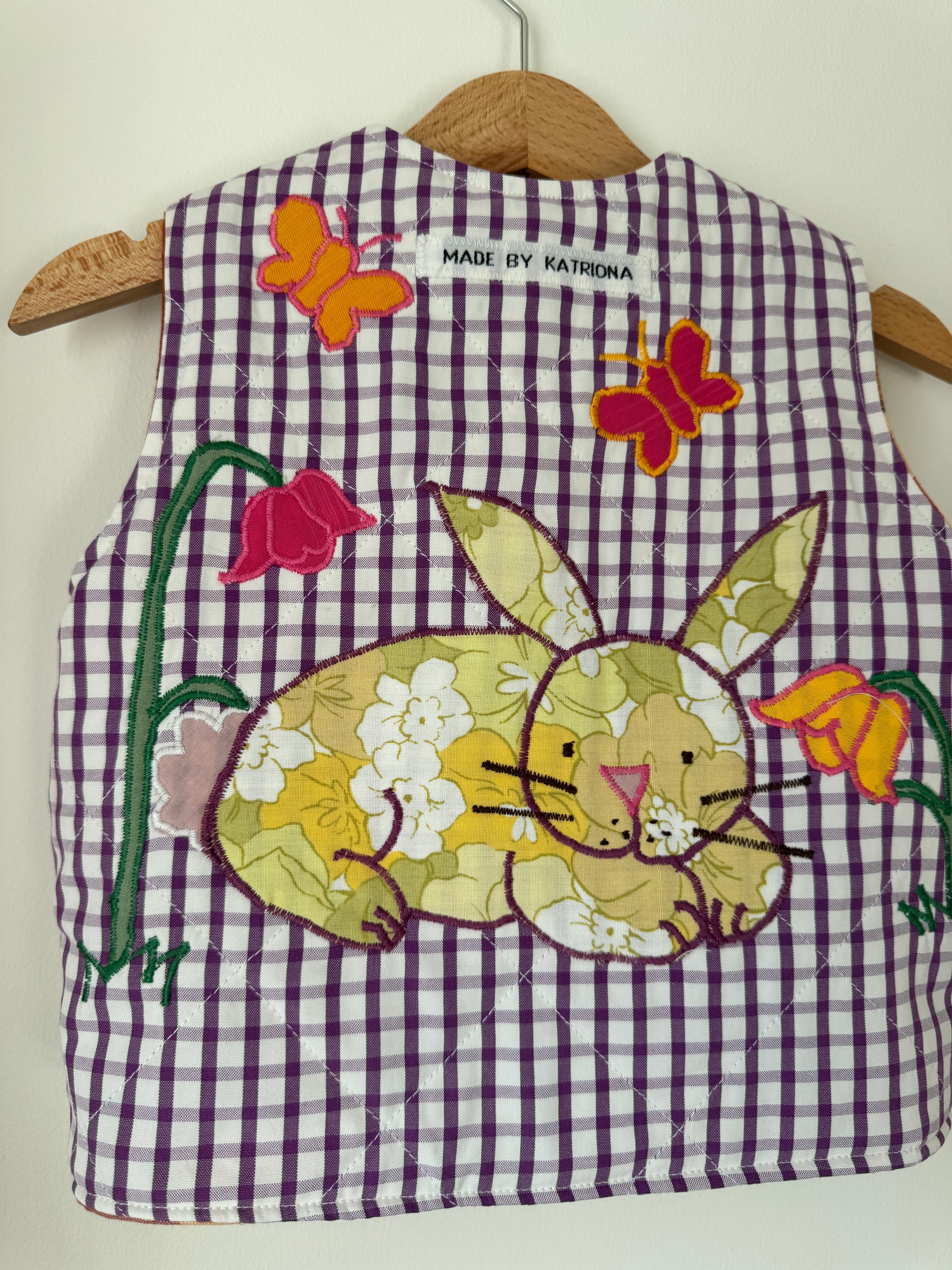 This reversible quilted gilet was inspired by the Usbourne books “That’s not my….” in this case bunny was the subject. It’s been made from thrifted bed sheets and scrap fabrics from my collection left overs from other upcycling projects.
