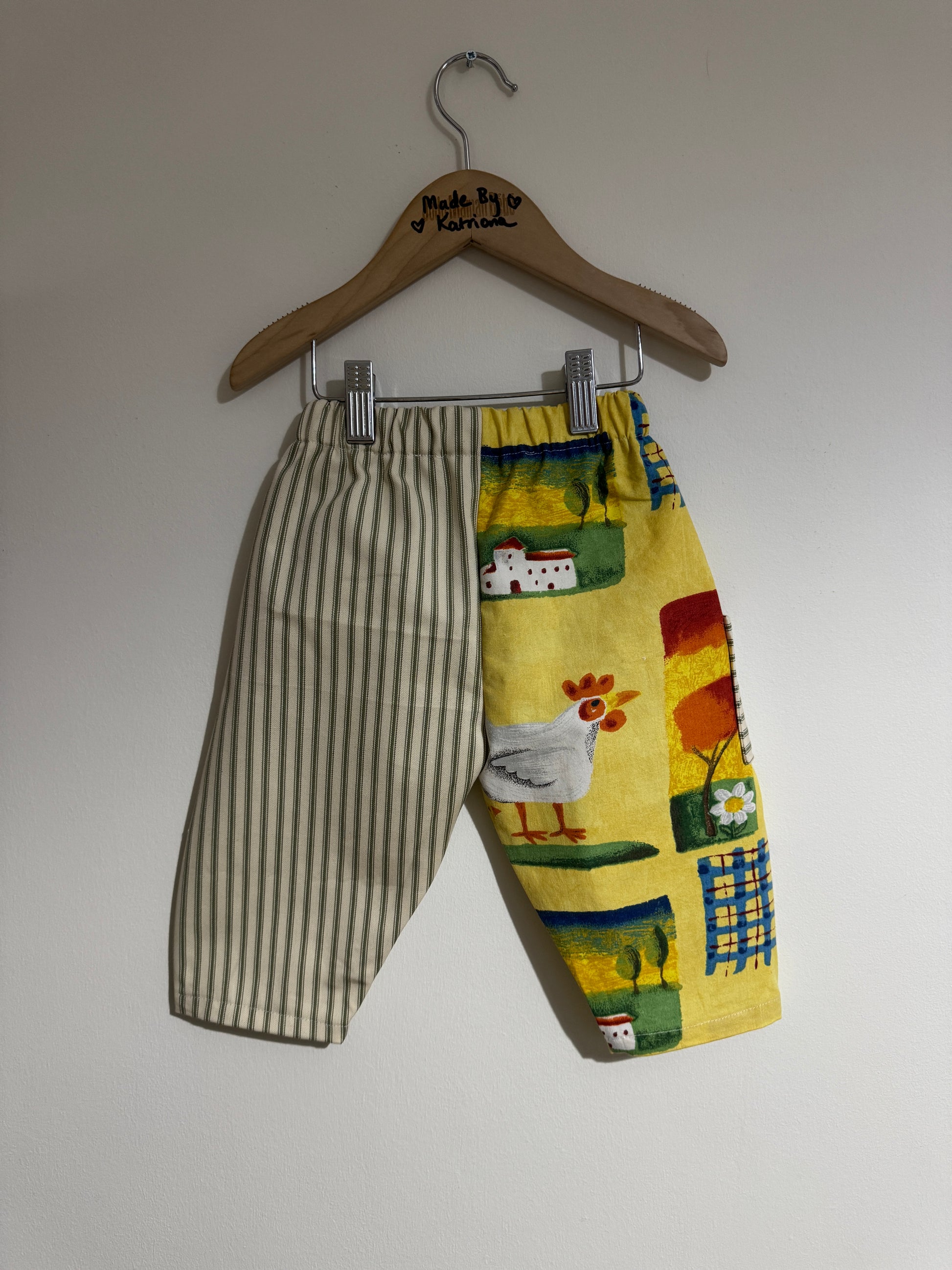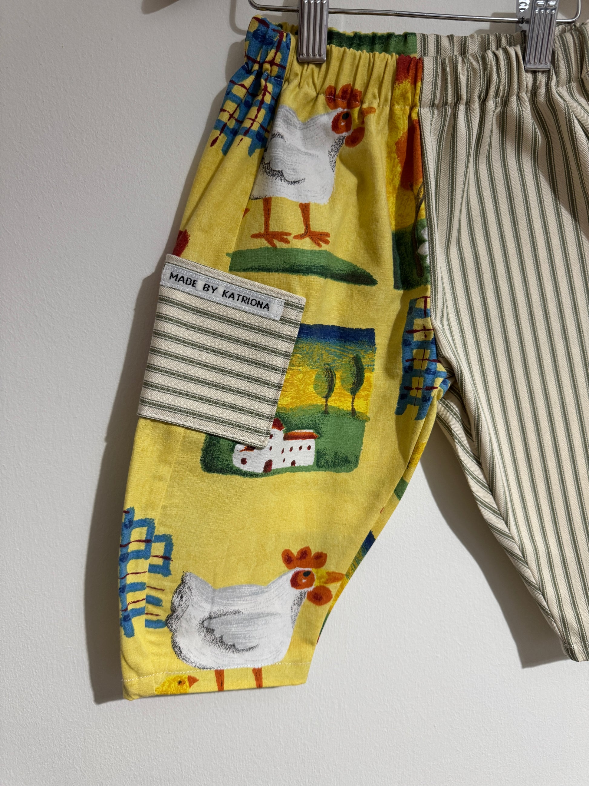 Fabric should be cotton but cannot 100% confirm as the yellow hen fabric was a handmade cushion and the ticking stripe a remnant given to me by a friend.