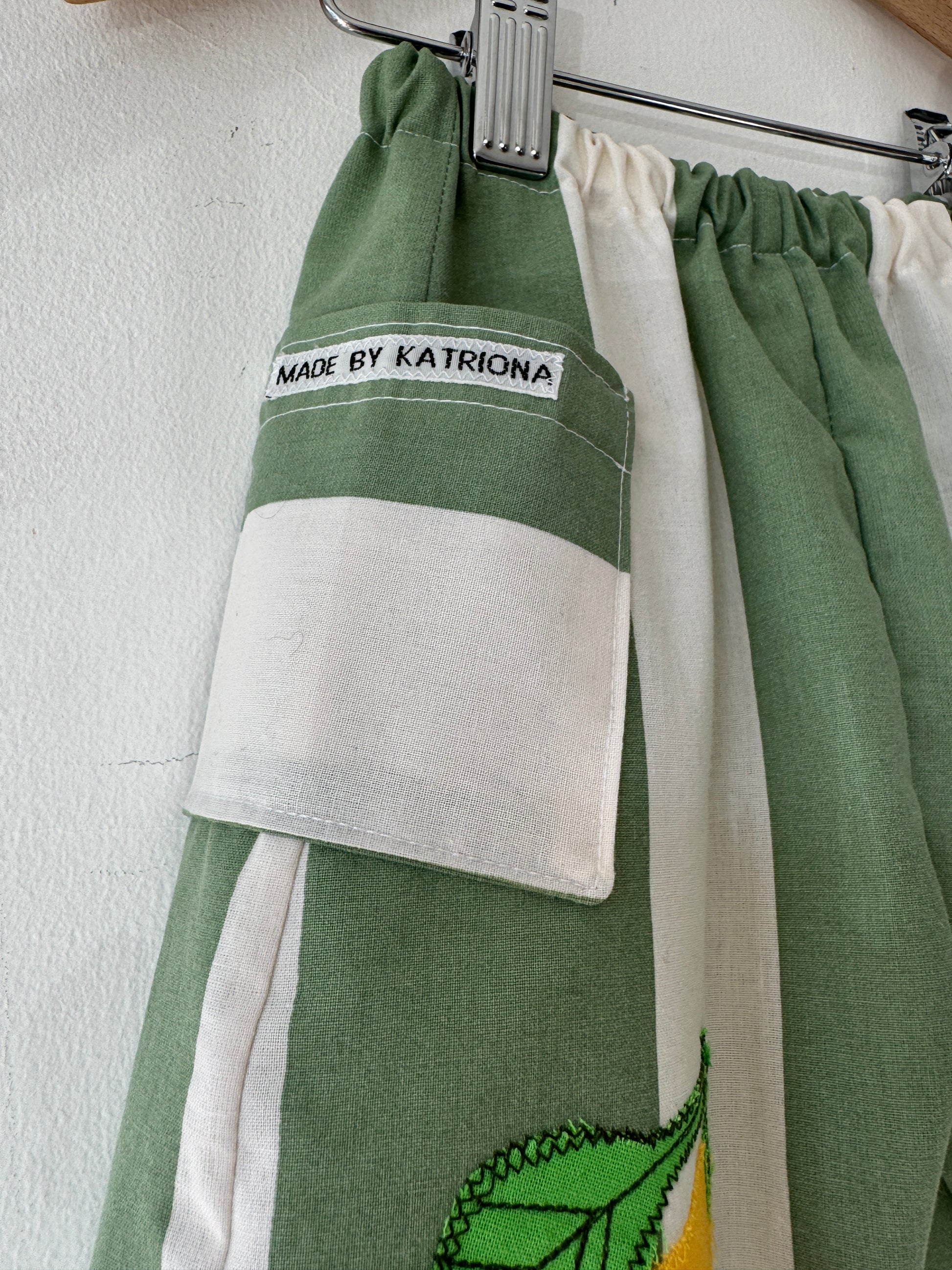 Brighten your toddler's wardrobe with these charming green-striped pants, lovingly handcrafted from upcycled bed sheets. Each pair features a hand-appliquéd lemon design, ensuring no two are alike. Perfect for eco-conscious parents seeking sustainable and stylish clothing options for their little ones.