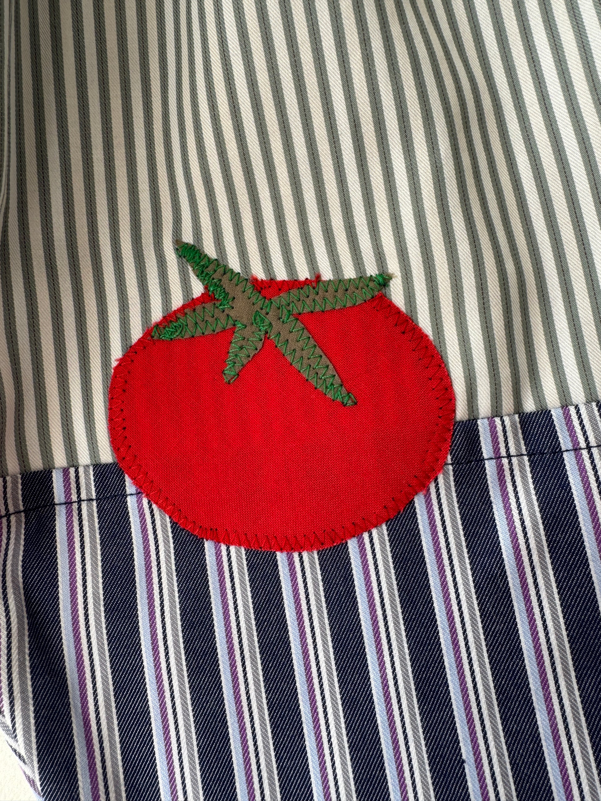 Made with preloved shirts featuring fun eye catching tomato appliqués at the knees.