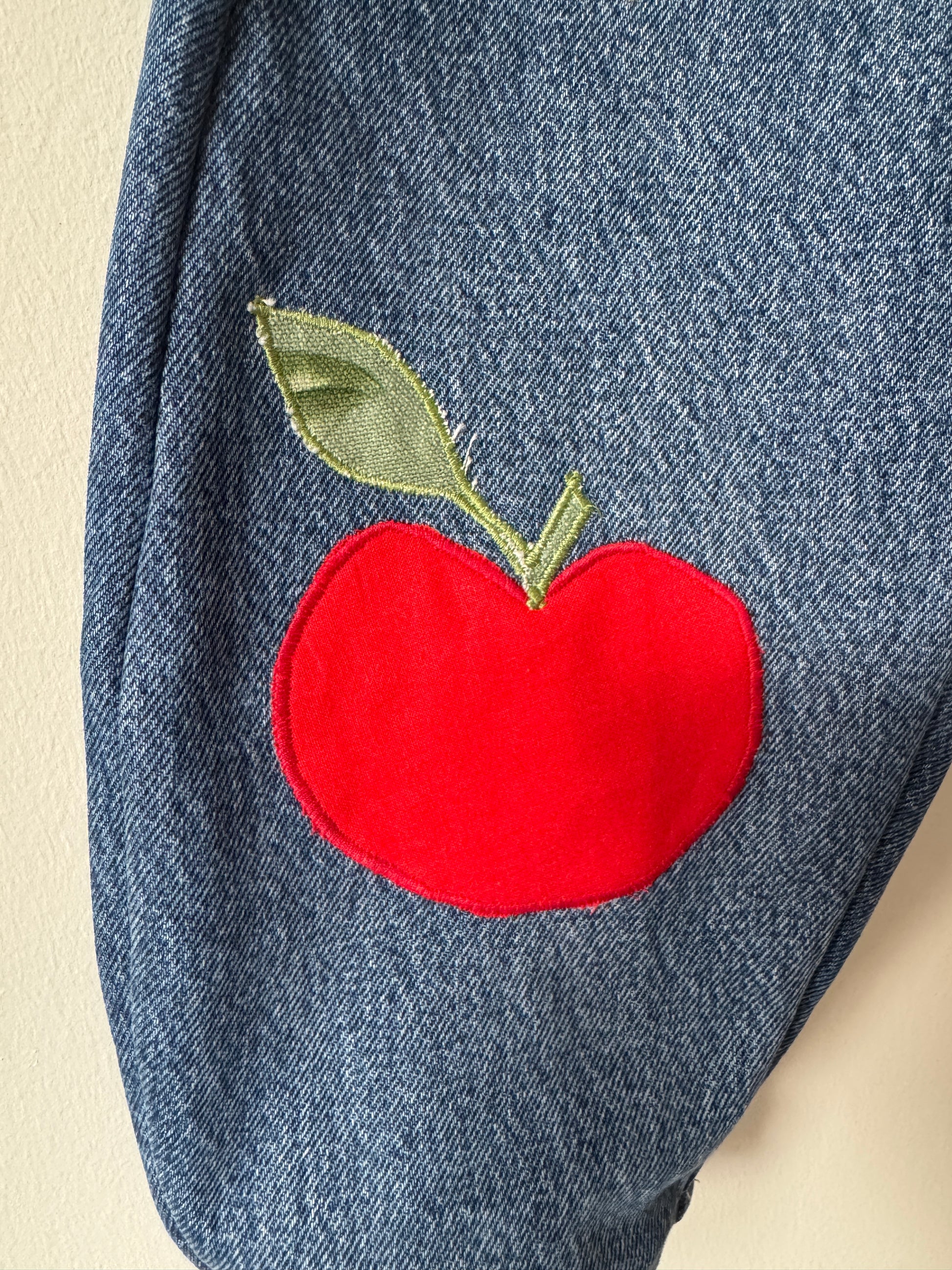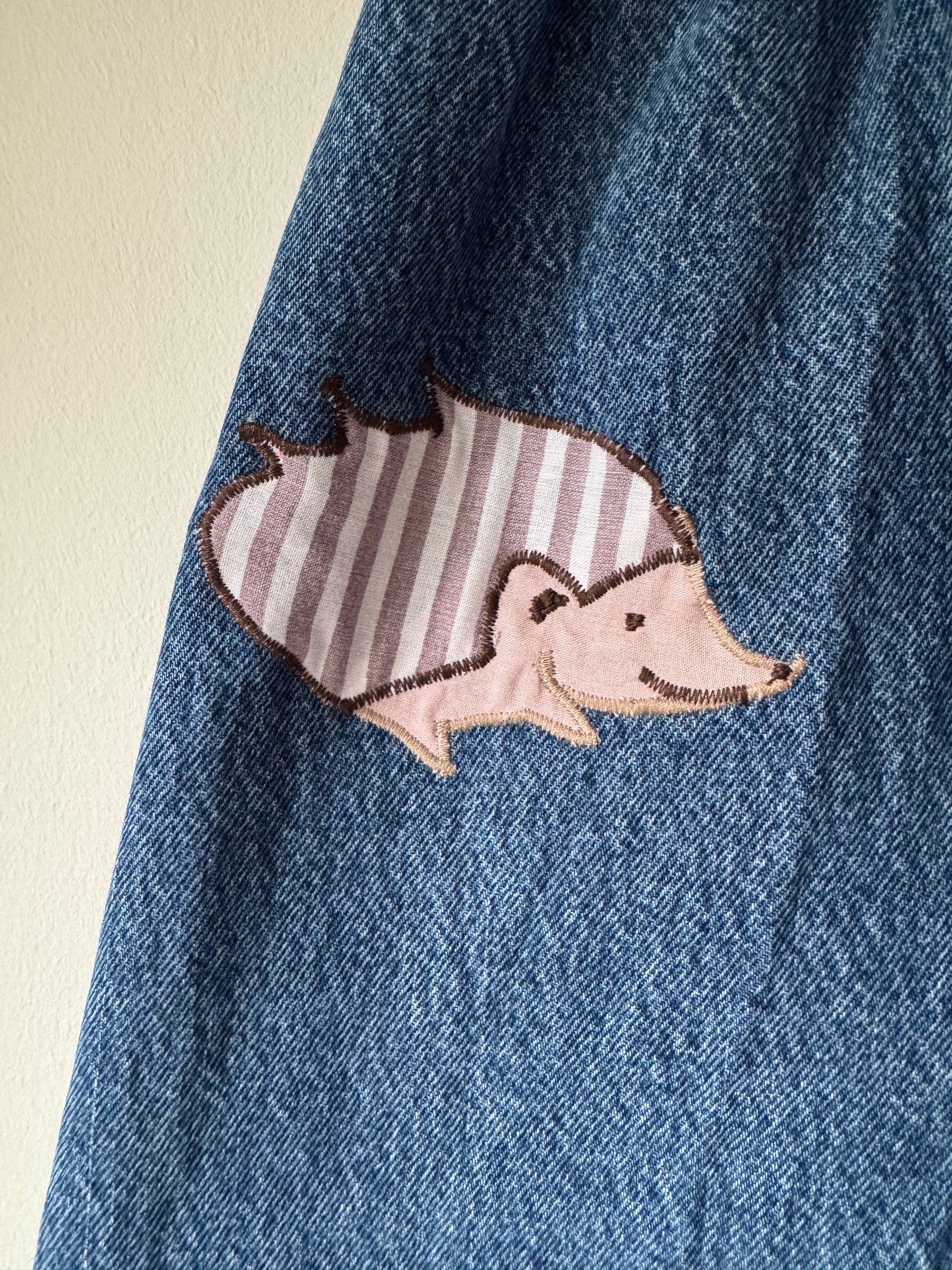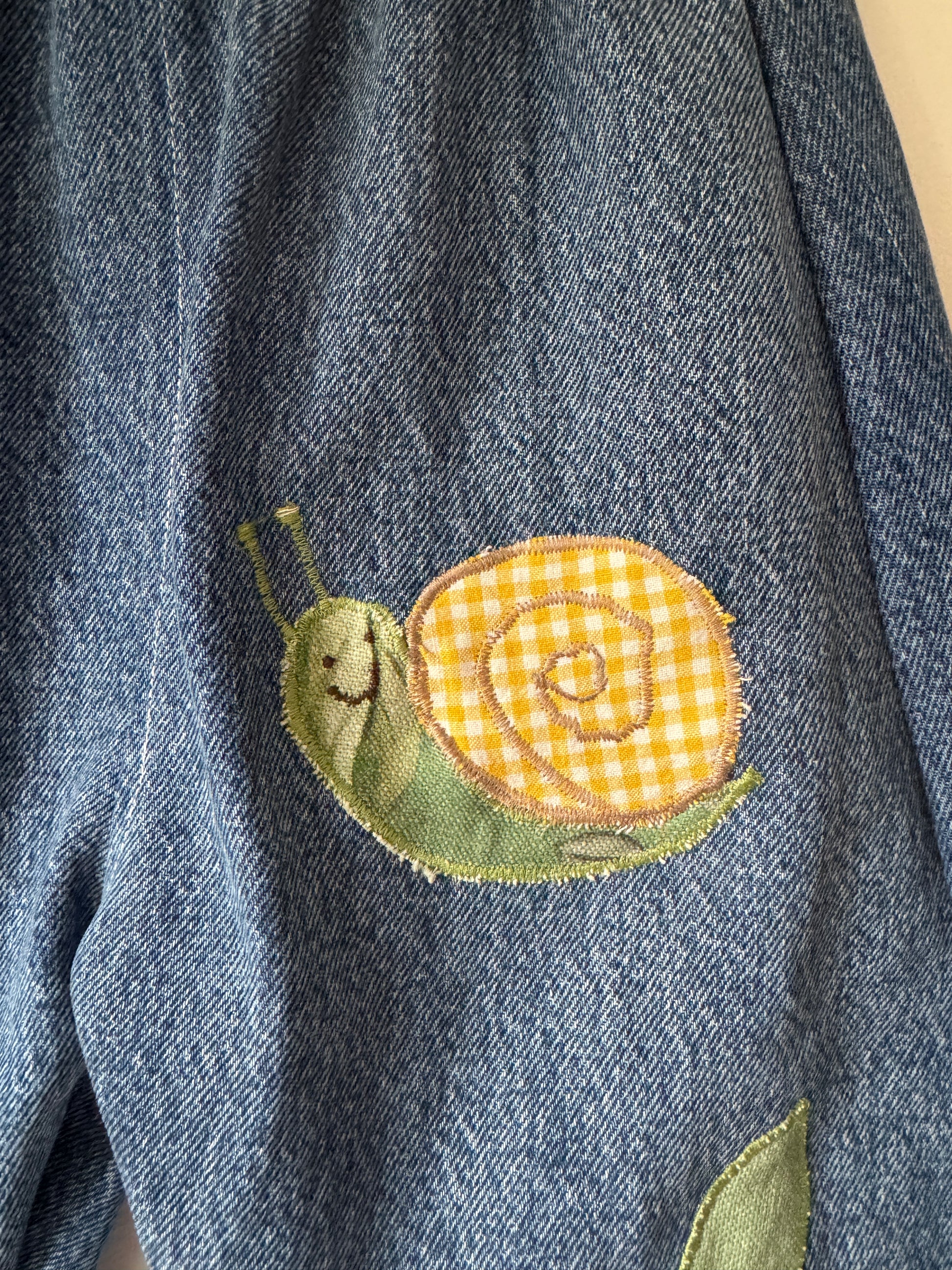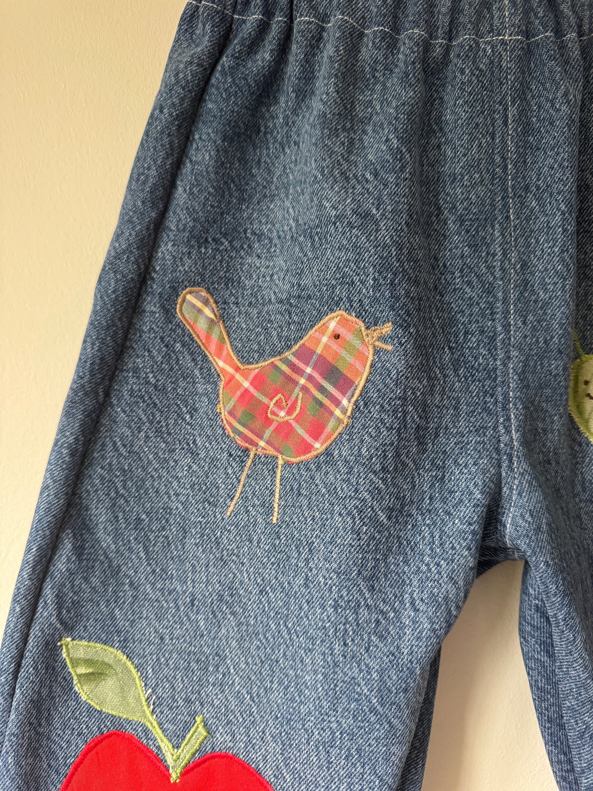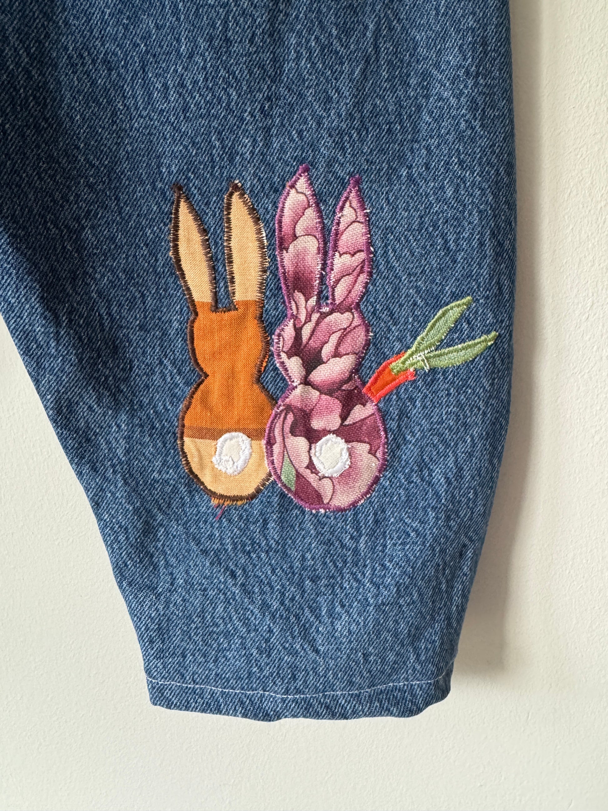This pair has been crafted from a preloved denim jeans so 100% cotton and heavier weight so very durable. These one of a kind jeans feature two apple appliques at the knees, a little check bird, a yellow gingham snail, a brown striped hedgehog & a couple of bunnies holding a carrot made from off-cuts from other upcycling projects.